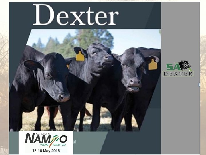 HOEKOM DEXTERS? Goeie voeromset – 5. 73 kg per 1 kg vleis (VOV) Goeie groei – 1. 4 kg per dag (ADG) Beste koei / kalf speenverhouding van alle rasse – 55. 9% teenoor 45. 5% van land se koeikudde Uitstekende dubbeldoel bees Baie goeie alternatief om verse mee oop te maak in suiwel- sowel as vleiskuddes Swart, Rooi en Dun diere Meer vleis per hektaar word deur ‘n dexter geproduseer. 3 Dexters in die plek van 2 grootraambeeste. Maak maar die som! Goeie moeders instink Uitstekende temperament Baie goeie vleis kwaliteit met uitstekende marmering en ideale snitgrotes Baie gehard en aanpasbaar is alle streke KAN JY BEKOSTIG OM NIE MET DEXTERS TE BOER NIE?