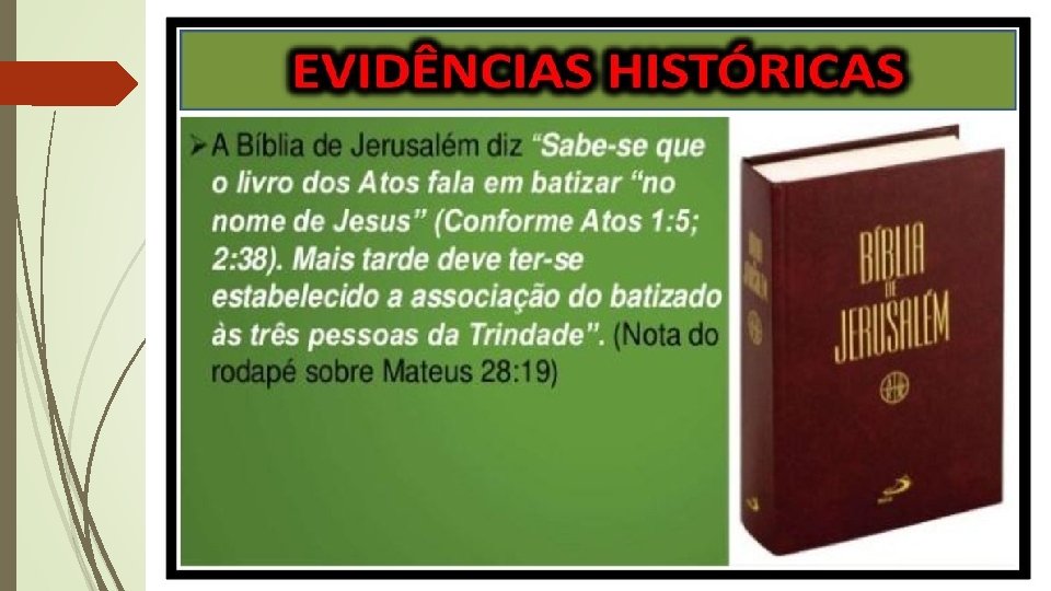 ENCICLOPÉDIA AMERICANA, Vol XXVII, pg 294 “O Cristianismo derivou-se do Judaísmo, e o Judaísmo era estritamente unitário. O caminho que levou de jerusalém a Nicéia dificilmente foi em linha reta. O trinitarismo do quarto século de nenhuma forma refletiu o primitivo ensino cristão sobre a natureza de Deus; foi ao contrário, um desvio desse ensinamento”. DICTIONARY OF THE BIBLE, John Mac Kenzie, 1965, pg. 899 “A Trindade de pessoas dentro da unidade de natureza é definida em termos de ‘pessoa’ e de ‘natureza’, que são termos filosóficos gregos; na realidade esses termos não aparecem na Bíblia. As definições trinitárias surgiram em resultado de longas controvérsias, em que esses termos e outros, como ‘essência’ e ‘substância’, foram erroneamente aplicados a Deus”. BÍBLIA DE JERUSALÉM, 10 a edição, 2001, pg 1896 Nota de rodapé: Mt 28, 19 “Sabe-se que o livro de Atos fala em batizar “no nome de Jesus”(cf. At 1, 5 +; 2, 38+). Mais tarde deve ter-se estabelecido a associação do batizado às três pessoas da Trindade”. TRUE CHISTIANITY – Rev. Steve Winter ATOS 4: 12 “Batismo em nome de Jesus. E em nenhum outro há salvação, porque também debaixo do céu nenhum outro nome há, dado entre os homens, pelo qual devamos ser salvos. ”