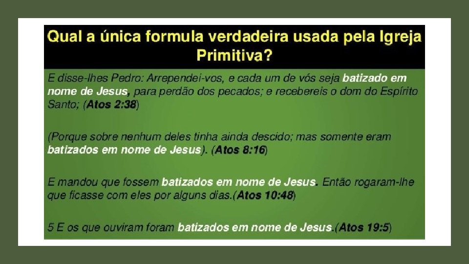“Eles, tendo ouvido isto, foram batizados em o nome do Senhor Jesus. ” - Atos 19: 5. “fomos batizados em Cristo Jesus”. Romanos 6: 3 “Acaso Cristo está dividido? Foi Paulo crucificado em favor de vós, ou fostes porventura, batizados em nome de Paulo? ” - I Coríntios 1: 13. “Porque todos quantos fostes batizados em Cristo, de Cristo vos revestistes. ” - Gálatas 3: 27. “E tudo quanto fizerdes por palavras ou por obras, fazei-o em nome do Senhor Jesus, dando por ele graças a Deus Pai. ” Colossenses 3: 17.