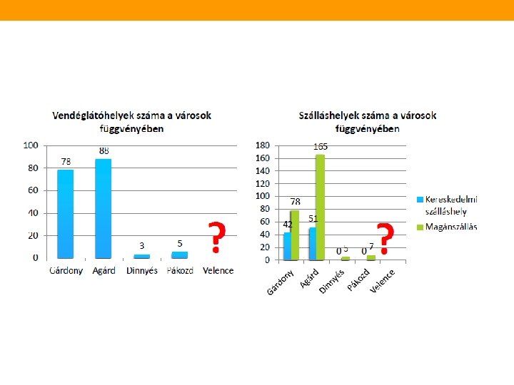 Vendéglátó egységek száma (db) Gárdonyban és Pákozdon • Mindösszesen 174 db van. • Ebből TDM tag: 6 db • A legtöbb vendéglátóhely, 88 db Agárdon található. • Gárdonyban 78 vendéglátó hely van bejelentve.