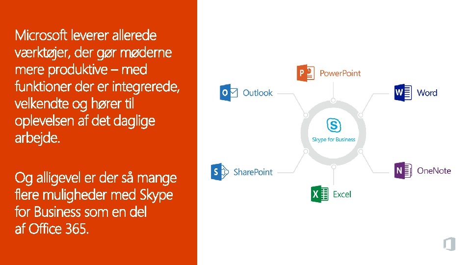 Office 365 og Skype for Business Dynamisk deling og samarbejde, som gør det lettere at afholde mere effektive møder og få arbejdet fra hånden.