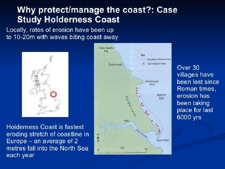 Holderness protection objectives and management strategies Since the late 19 th century coastal protections have been used to enforce a ‘hold the line’ policy at the coastal towns of the Holderness coast. In between the coastal towns large areas are also eroding while no measures are taken. Nowadays the local and regional authorities are trying to set up integrated coastal zone management programmes for the whole Holderness coastline and the Humber estuary. In the ‘East Riding Integrated Coastal Zone Management Plan’ the policy options (do nothing of hold the line) are given along the Holderness coast, these are shown in Table 3. The policy option managed realignment is being considered at Holderness for the future (see Strategy).