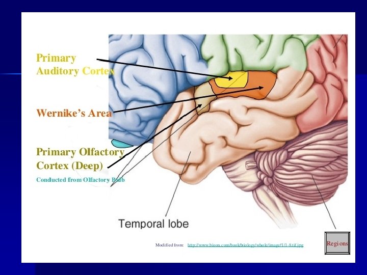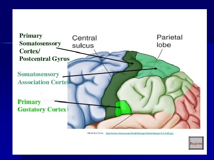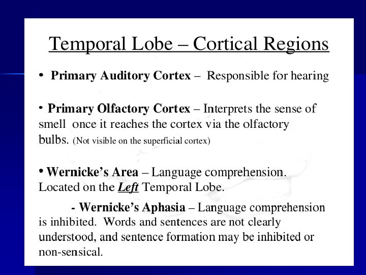 Sensory Areas n Conscious awareness of sensations: – Primary Somatosensory Cortex n n parietal lobe sensations on skin – Visual (Cortex) Area n n occipital lobe interprets vision – Auditory (Cortex) Area n n temporal lobe interprets hearing – Gustatory Cortex n n near bases of the central sulci Taste – Sensory Area for smell n arise from centers deep within the cerebrum