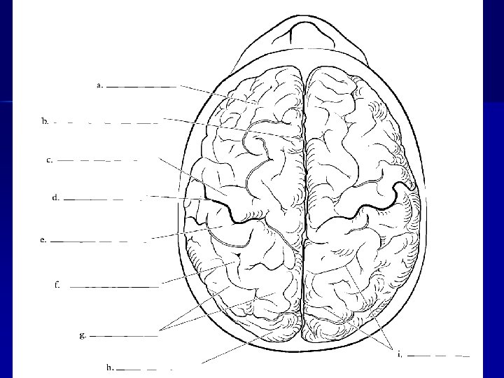 Structure of the Cerebrum n Cerebrum: the largest portion of the brain; two cerebral hemispheres – Corpus callosum: nerve fibers that connect the hemispheres – Convolutions (gyri): surface ridges – Lobes divide the hemispheres: frontal, parietal, temporal and occipital – Tyo types of grooves: n n Sulci: shallow Fissure: deep
