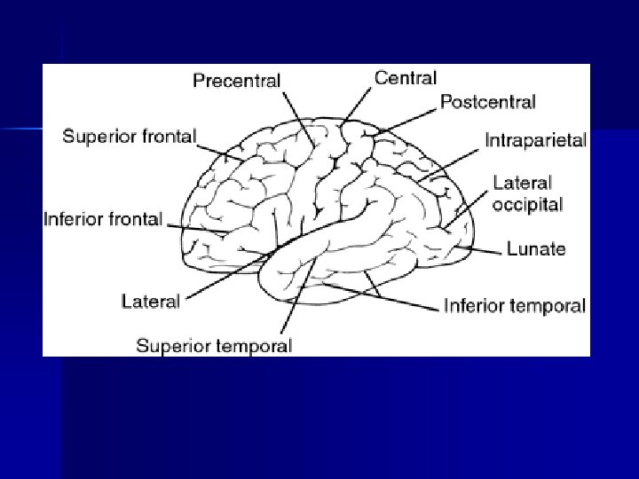 Central Sulcus Precentral Gyrus Postcentral gyrus Parietal Lobe Frontal lobe Lateral Fissure Occipital lobe Temporal lobe Cerebellum