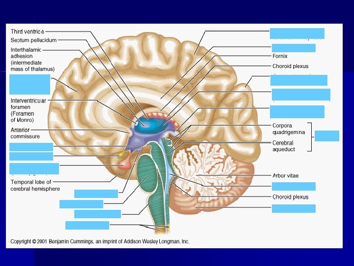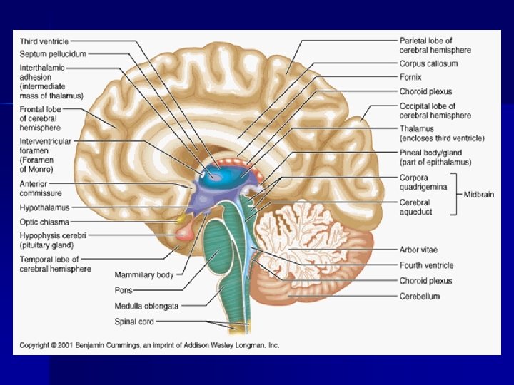 Corpus callosum Thalamus Pineal gland Parietal Frontal Sup. Colliculus (midbrain) hypothalamus C. Aquaduct Mammilary body Occipital Inf. Colliculus (Midbrain) Cerebellum Optic chiasma Pituitary Cerebral Penduncle (midbrain) Pons 4 th ventricle Medulla Oblongata