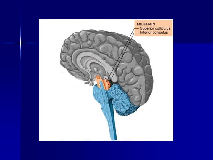 Midbrain n n Between diencephalon and pons Corpora quadrigemina = 4 dome-like protrusions on the dorsal midbrain surface Gray matter within white matter Acts in reflex actions (visual and auditory) Contains areas associated with reticular formation.