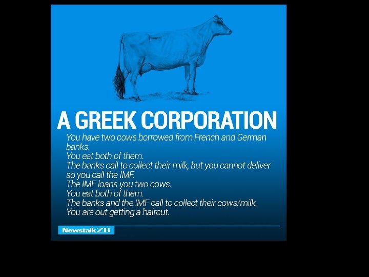 And continued… PURE COMMUNISM You have two cows. Your neighbours help you take care of them, and you all share the milk. RUSSIAN COMMUNISM You have two cows. You have to take care of them, but the government takes all the milk. SINGAPOREAN DEMOCRACY You have two cows. The government fines you for keeping two unlicensed farm animals in an apartment. AMERICAN DEMOCRACY The government promises to give you two cows if you vote for it. After the election, the president in impeached for speculating in cow futures. The press dubs the affair ‘cowgate’.