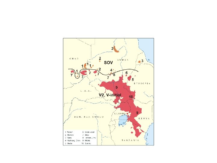 • Southern Eastern Sudanic: Strongly head marking at the clausal level (verbal extensions expressing direction, benefactive, instrument etc. ). Compare Maasai: a -I rra g-a a 1 SG-sleep-IT Narok: ABS ‘I sleep at Narok’ a -bo l-o ki 1 SG-open-DAT • • a ro k papa O lb. E n. E father. ABS basket: ABS ‘I open the basket for father’ a -du -i e Enka l. E m 1 SG-cut-INST knife: ABS ‘I cut it with a knife’ Split ergativity with post-verbal (but not pre-verbal) Agents in transitive clauses. Remnants of peripheral case marking, e. g. in Nilotic Nuer: Citation l. E p l. O c Locative l. E b ‘tongue’ l. O Oi ‘heart’