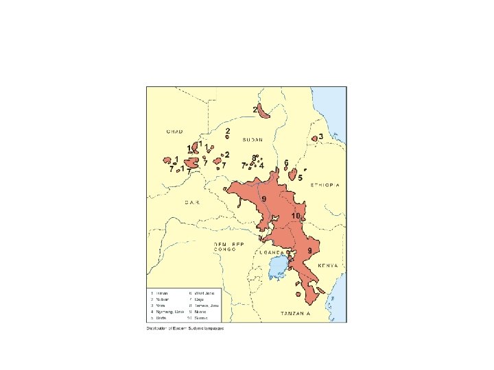 The principle of least effort • Highest degree of genetic diversity along an westeast axis (Saharan, Maban, For, Kunama, Central Sudanic, Eastern Sudanic) • Eastern Sudanic consists of three subgroups: – The Northern subgroup: • Taman, Nubian, Nyimang plus Dinik, Nara, Meroitic. – The Central subgroup: • Eastern Jebel – Southern subgroup: • Temein plus Keiga Jirru, Daju, Surmic, Nilotic