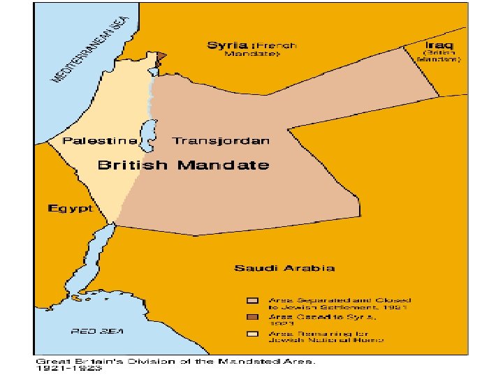 Post war British Mandate • 1919 League of Nations gives Britain mandate over Palestine • Britain had authority over Palestine until the region was ready for self-government • Some said that Britain was given a “poisoned chalice” • What might this mean?