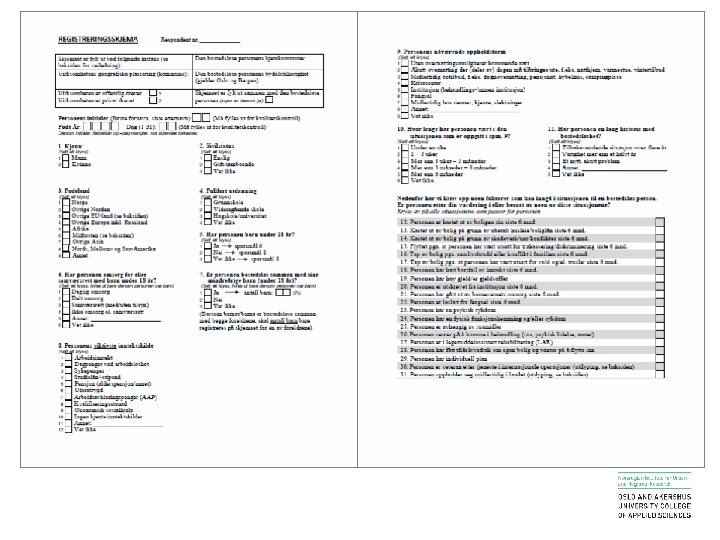 Measuring homelessness • Cross sectional survey – time window of one week • Respondents: municipal services and agencies (social services), NGOs, other private services, state agencies (national health services and correctional services) • One questionnaire for each homeless person the respondents are in touch with or know of in the time window • Time series with data on individual level Homeless persons in touch with and/or known by a wide range of services