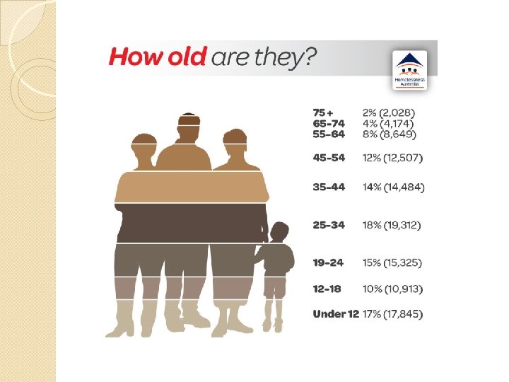 The Problem � In the midst of Perth’s thriving prosperity live 000 s of homeless people ◦ 9, 600 in WA (42. 8 people per 10, 000) ◦ 5, 000 in Perth � 56% male, � Staying in: ◦ ◦ ◦ 10% 14% 43% 23% 1% 44% female Improvised dwellings, tents or sleeping out Supported accommodation for the homeless Boarding houses “Severely” overcrowded dwellings Staying temporarily with other households Other temporary lodging