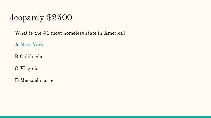 Jeopardy $2500 What is the #1 most homeless state in America? A. New York B. California C. Virginia D. Massachusetts