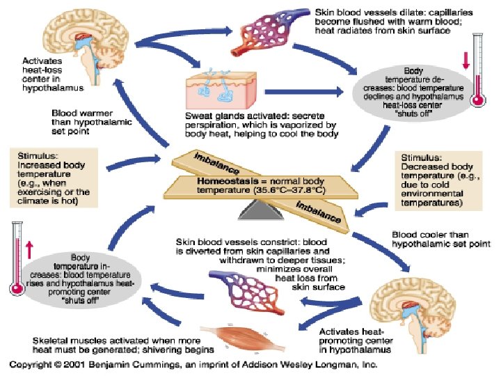 What is the. . . Variable? Stimulus? Receptors aren’t shown on this picture, but there are two sets of thermoreceptors: some in the hypothalamus to measure internal temperature , and some in the skin to measure external temperature Control center? Effector?