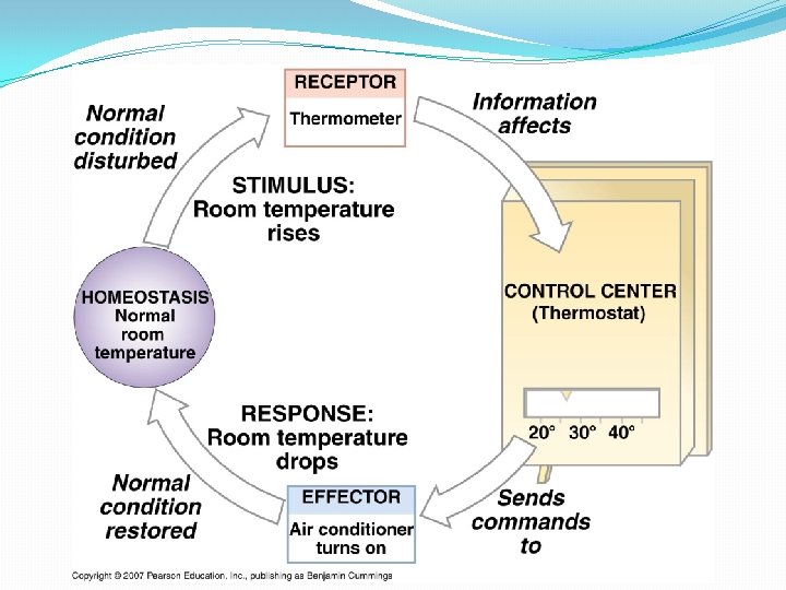 Homeostasis as Room Temp Thermometer (receptor) notices higher room temp (stimulus) 2. Thermostat (control center) receives and processes info 3. Air conditioner (effector) turns on 1.