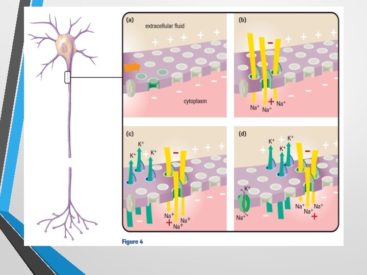 Action Potential • How does this happen? • Electrochemical event is caused by an unequal concentration of positive ions across the nerve cell membrane • Potassium ions inside the cell move out of the cell (via ion gates) and sodium ions move into the nerve cell. 50 x more K+ moves out than Na+ in. • Outside becomes more positive so consequently inside becomes negative (-70 m. V is the resting potential of a polarized membrane. (-90 m. V would mean that more K+ ions had moved out of the membrane) • When excited the nerve cell become more permeable to Na+ than K+. This allows Na+ to rush into the nerve cell (depolarization)