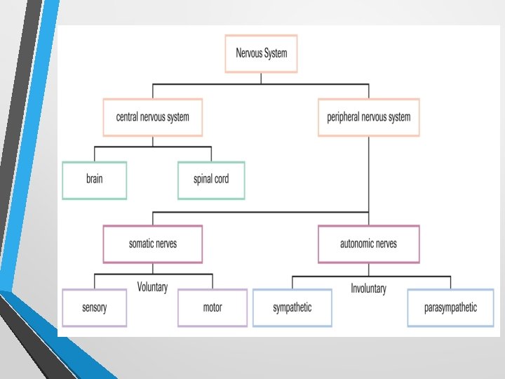 The Nervous System – 9. 1 • Vertebrate Nervous System is a highly organized communication network that allows the brain to gather information about the body, process that information and then act on it. • Two main divisions: • Central Nervous System brain and spinal cord • Peripheral Nervous System nerves that carry information between organs and the CNS • Somatic Nerves skeletal muscle, bones, skin • Sensory somatic nerves relay information about environment to CNS • • Motor somatic nerves initiate an appropriate response Autonomic internal organ control • Sympathetic Nervous System nerve cells that prepare the body for stress. • Parasympathetic Nervous System nerve cells that return the body to a normal state after stress.