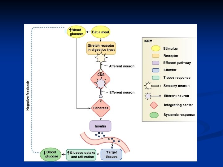 Homeostatic Control Systems n In order to maintain homeostasis, control system must be able to Detect deviations from normal in the internal environment that need to be held within narrow limits n Integrate this information with other relevant information n Make appropriate adjustments in order to restore factor to its desired value n
