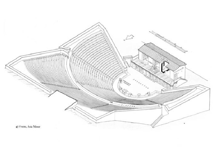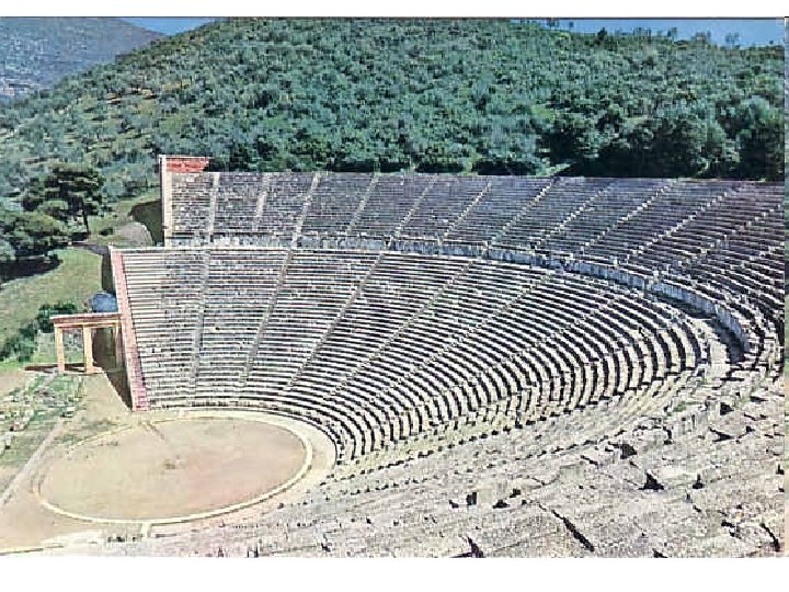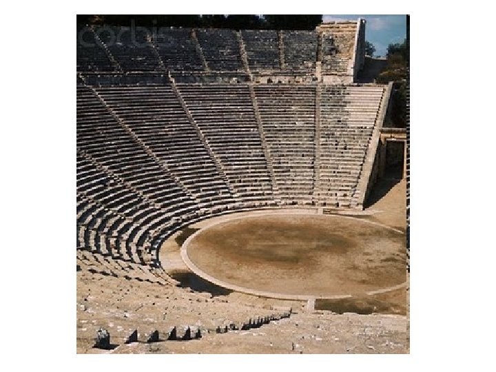 The Theatron – ‘Watching Place’ • Contained tiers of seats looking down on the dancing circle (orchestra), giving good visibility • Seats arranged in arcs, separated by passages – For ease of access • Stairs radiated out from the centre – these formed wedge-shaped sections • Partly raised on a hill and partly on terraces of earth and rubble contained by supporting walls • Spectators in the back row were 90 m from the stage • An actor 2 m tall looked 1. 8 cm high from the back • This explains the need for grotesque masks & exaggerated phalloi (phalluses all male characters wore) • Semi-circular shape gave great acoustics