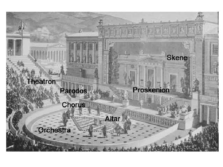Proskenion • This was the stage in front of the stage building (skene) • It was probably decorated with pillars • Most likely formed a permanent set – Changes could be made to suit each play’s demands – by painting – A fixed scene could still represent many different buildings.