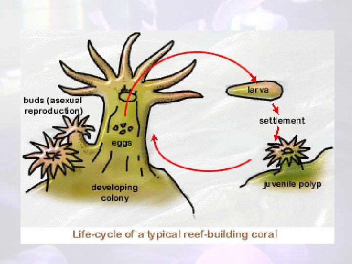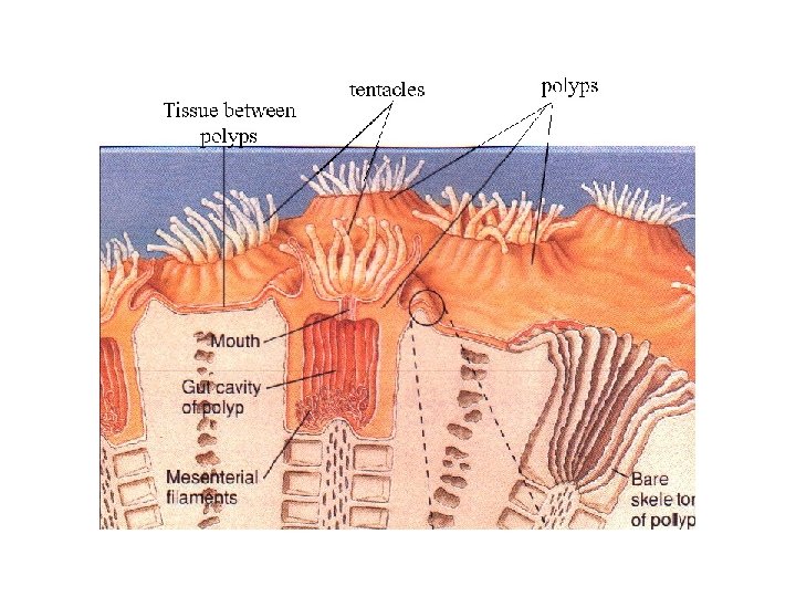 The Man-of-War has a gas filled float and individuals that function like specialized organs. Some are carnivores with digestion in food vacuoles. The coral animal may live as a free-floating polyp or build colonies into reefs, but not all corals build reefs. 1. stony coral hermatypic or reef builders. The polyp grows in 6 parts to form a body of calcium carbonate ex: brain, staghorn, golf ball