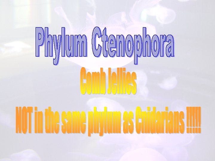 Phylum Ctenophora – Comb Jellies • Gelatinous, radial symmetry • 8 rows of cilia “combs” • 2 sticky colloblasts
