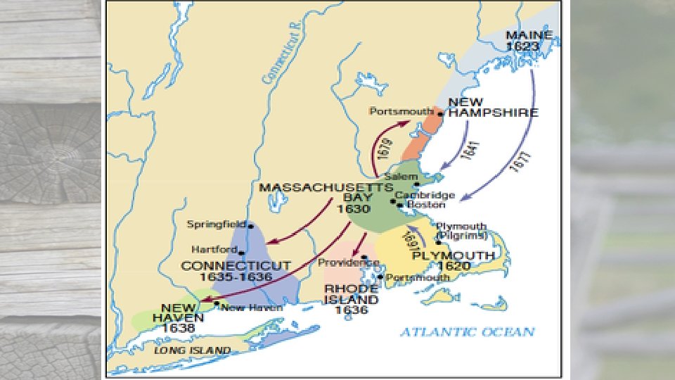 Other New England Colonies Ø In 1638, New Haven was founded on the premise of having a tighter church -government than Massachusetts Bay, but it eventually merged with Connecticut in 1662. Ø In 1623, Maine was controlled by Sir Ferdinando Gorges and attempted colonization failed. Gorges’ heirs sold it to Massachusetts Bay in 1677, and it would remain part of Massachusetts for another century and a half. Ø New Hampshire sprang into being from fishing and trading activities along its coast. In 1641, it was absorbed into Massachusetts Bay.