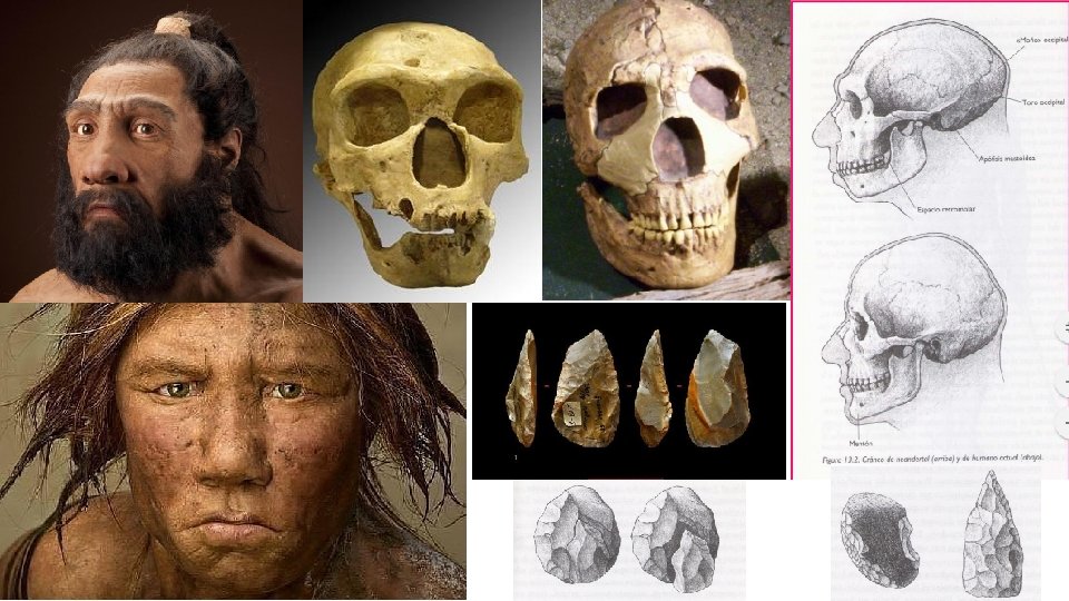 HOMO NEANDERTHALENSIS (130 MIL – 30 MIL AÑOS AP EN EUROPA Y CERCAO ORIENTE) CARACTERÍSTICAS: Adaptados a climas fríos y secos Cráneo largo y aplanado, bordes supraorbitales y encéfalo que alcanzó los 1500 c. c. Nariz prominente. Contextura corporal plenamente robusta. Presencia de heridas, fracturas y enfermedades degenerativas en los (Mayor complejidad social) Posibles prácticas funerarias Cazadores Controversia sobre el lenguaje. Tecnología Musteriense o Modo 3