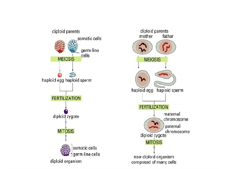 Meiosis makes sperm & eggs • 46 chromosomes to 23 chromosomes – half the number of chromosomes 23 46 meiosis 46 diploid egg 23 sperm haploid