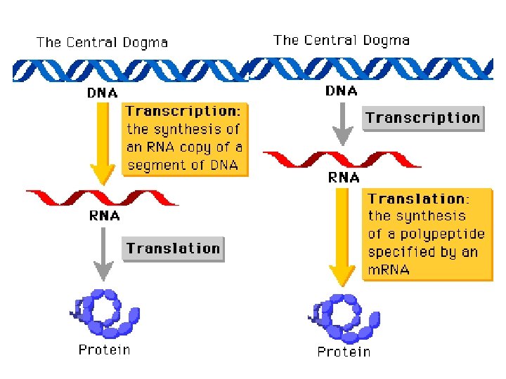 Transcription - m. RNA is made from DNA & goes to the ribosome Translation - Proteins are made from the message on the m. RNA