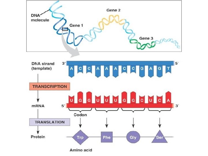 Central Dogma DNA m. RNA AGT CCA GCT codes transcription UCA GGU CGA codons t. RNA AGU CCA GCU Amino Acid Chain translation SER---GLY---ARG polypeptide anticodon
