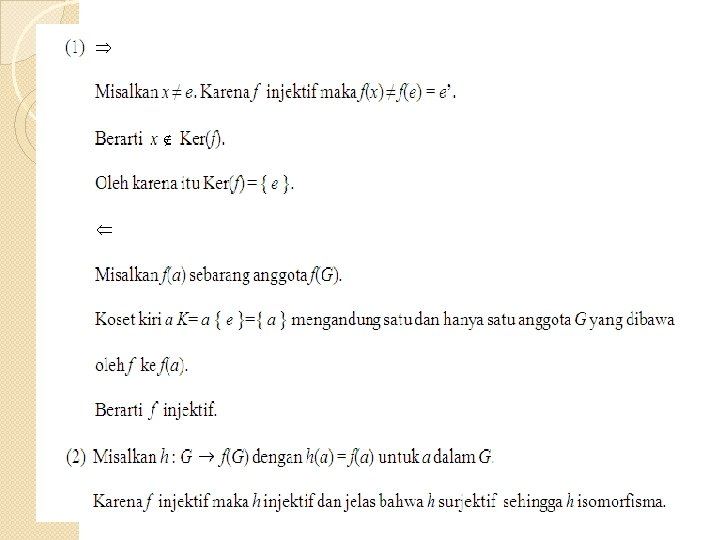 Teorema VII. 3 Jika f : G H homomorfisma grup maka Ker(f) grup bagian dari G. Bukti : Akan dibuktikan bahwa e dalam Ker(ƒ). �Telah ditunjukkan bahwa f(e) = e. �Akibatnya identitas e dalam G merupakan anggota Ker(f).
