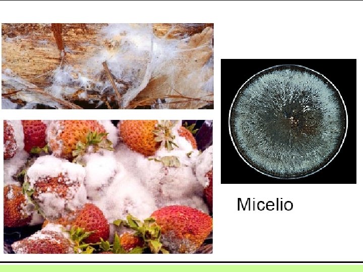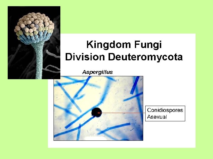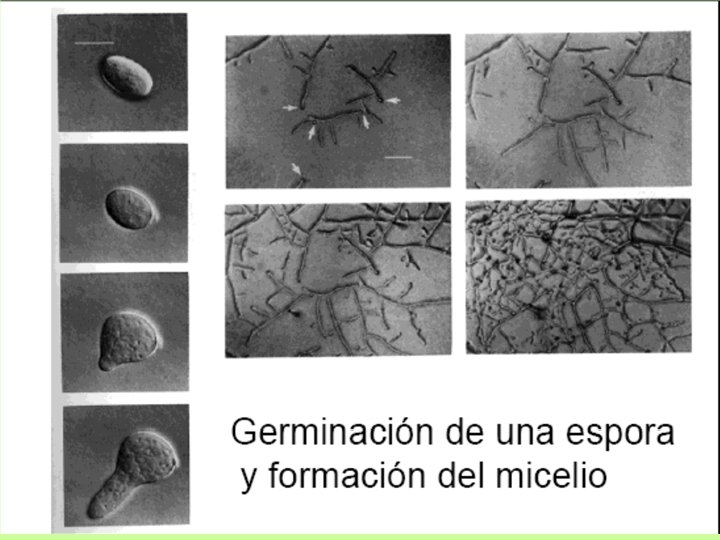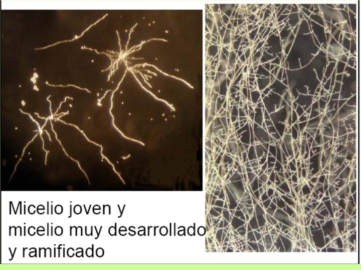 Deuteromicetos: • No se pueden clasificar dentro de ninguna división porque no se conoce la fase sexual. • Se reproducen asexualmente por conidios. Las esporas se forman en el extremo de las hifas.
