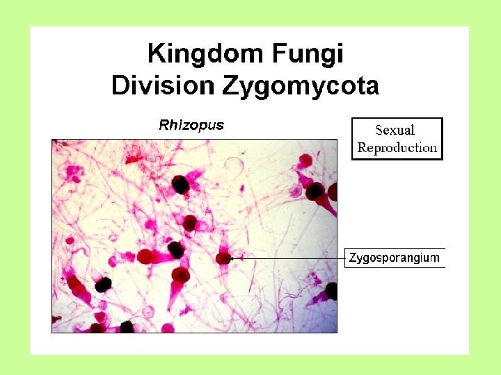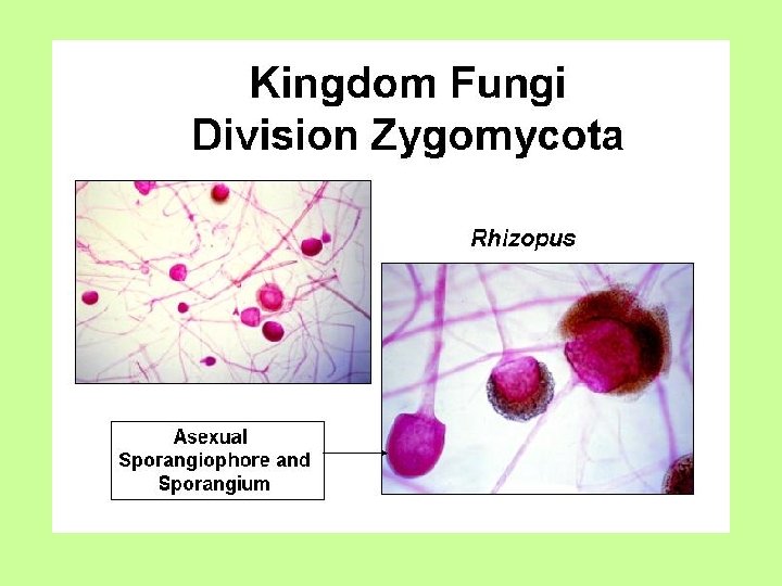 Reproducción La reprodución puede ser Asexual y sexual: • Asexual – Por esporas en esporangio. – Por gemación (levaduras) • Sexual (por esporas) – 2 hifas de individuos genéticamente diferentes se unen. – La hifa resultante sufre meiosis y se forman esporas sexuales haploides.