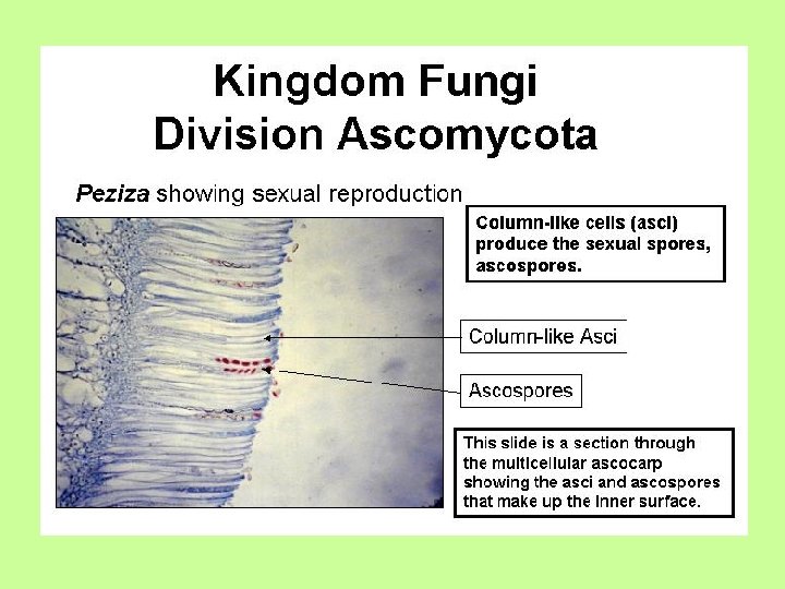 Ascomicetes. • Tienen hifas tabicadas. • Forman estructuras denominadas ASCAS, con forma de saco tras la fecundación. En ellas por meiosis se forman esporas haploides ASCOSPORAS. • Algunos forman parte de líquenes. • Incluyen muchos patógenos de plantas y animales • Incluye desde unicelulares (levaduras) hasta multicelulares