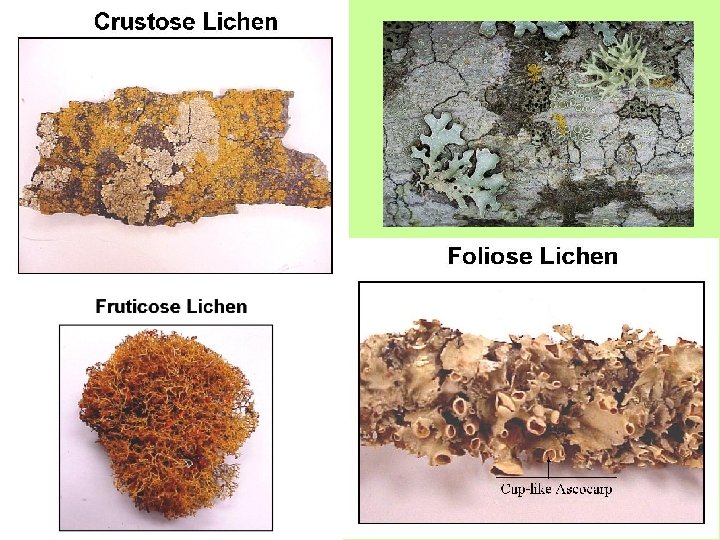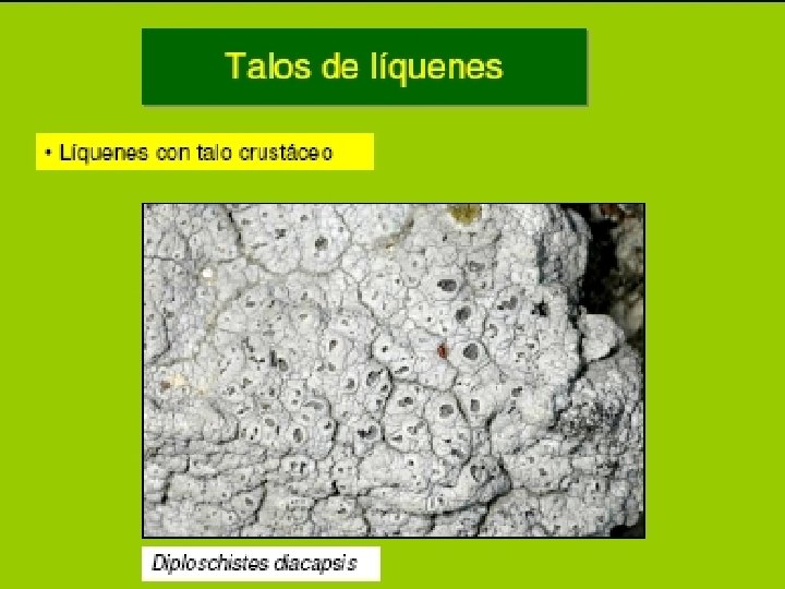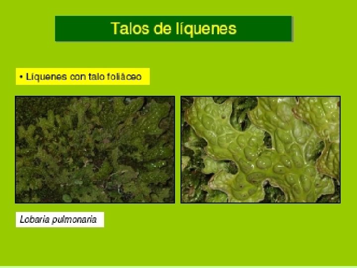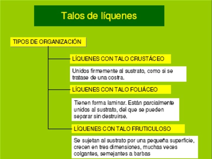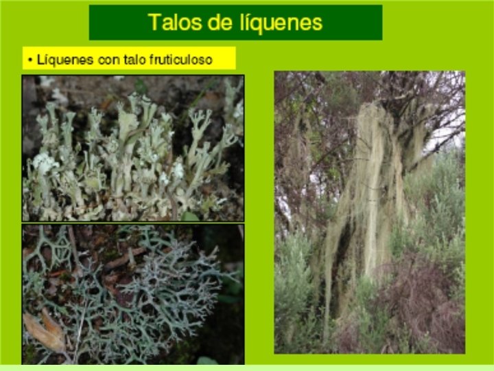 Líquenes: • Asociación simbiótica entre hongos (ascomicetos o basidiomicetos) y un alga cianofícea. • El alga provee alimento. • El hongo protege al alga de la desecación. • Sobreviven en ambientes extremos (rocas) y colonizan áreas nuevas. • No toleran contaminación, por lo que se utilizan como bioindicadores de contaminación.