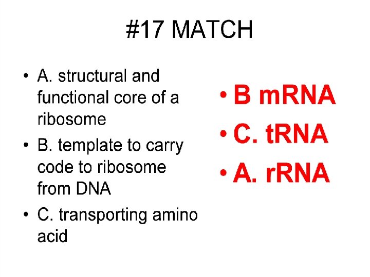 #17 What are the 3 types of RNA? • a) t. RNA (transfer RNA-brings amino acids) • b) m. RNA (messenger RNA-codes from DNA), and • c) r. RNA (ribosomal RNA-structural part of ribosome)