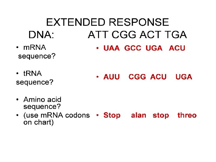 What is the complementary m. RNA strand? (DNA – m. RNA) • G-A-T-T-G-A-C-C-T-C-G–G • ANSWER: • C - U - A - C - U - G - A - G - C- C