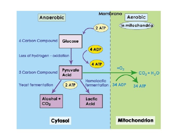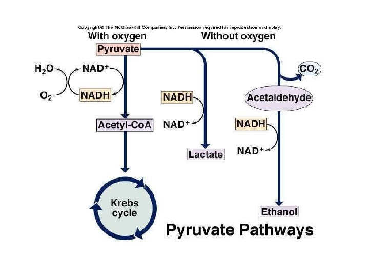 Fermentation anaerobic respiration Needs no oxygen • Makes no additional ATP after glycolysis • Hydrogen on NADH returns to pyruvic acid – Pyruvate is the “final electron acceptor” • NAD+ can be reused • Pyruvate is rearranged into a final product