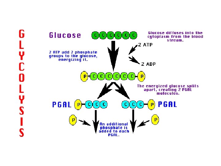 1 st stage – Glycolysis (in cytoplasm) Glycolysis - “sugar splits” - forms two smaller molecules Energy invested a. 2 ATP phosphorylate glucose b. glucose splits in two c. 3 -carbon intermediate forms (PGAL, G 3 P)