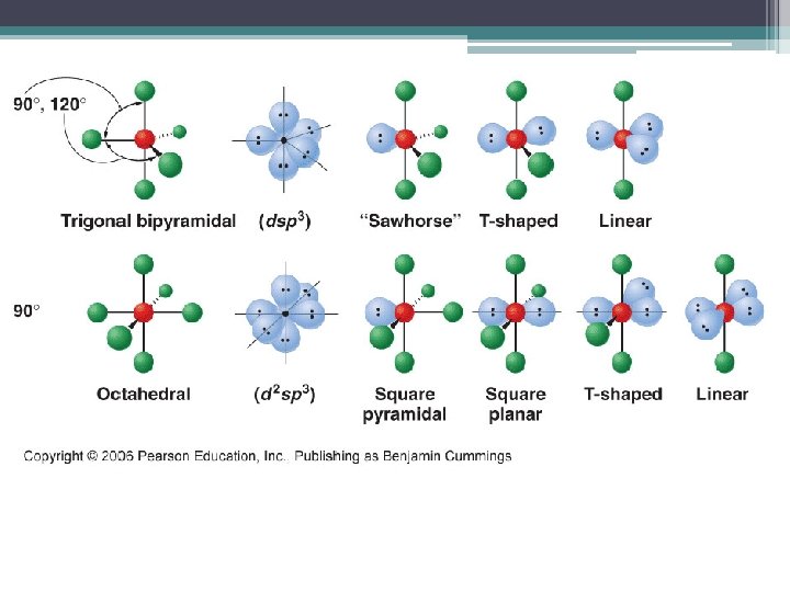 VSEPR Theory, continued • The same basic principles of VSEPR theory that have been described can be used to determine the geometry of several additional types of molecules, such as AB 2 E, AB 2 E 2, AB 5, and AB 6. • Treat double and triple bonds the same way as single bonds. • Treat polyatomic ions similarly to molecules. • The next slide shows several more examples of molecular geometries determined by VSEPR theory.