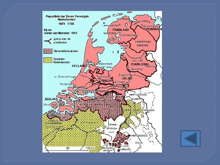 Laatste fase De strijd gaat door → patstelling Daarom 12 jarig bestand (1609 -1621) Daarna verovert Maurits delen van Brabant en Zeeuws Vlaanderen en Frederik Hendrik (na 1625) rest van Brabant en Limburg (Generaliteitslanden) In 1647 Willem II Die sluit de Vrede van Munster -Spanje legt zich neer bij verlies De Rep -zuiden blijft bij Spanje (Spaanse Nederlanden)