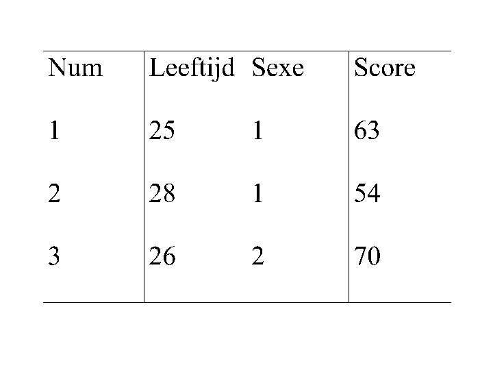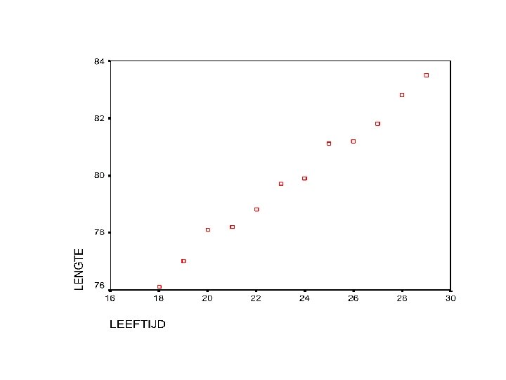 • Voorbeeld : gemiddelde lengte naar leeftijd in maanden 18 19 20 21 22 23 24 25 26 27 28 29 lengte in cm 76. 1 77. 0 78. 1 78. 2 78. 8 79. 7 79. 9 81. 1 81. 2 81. 8 82. 8 83. 5