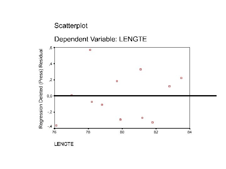 • Voorbeeld : - bij 24 maand was de lengte 79. 9 cm - regressielijn : y = 64. 93 + (0. 635 X 24) = 80. 17 - het residu bedraagt 79. 9 - 80. 17 = -0. 27 • residuen zijn de verticale afstanden tot de regressielijn • het zijn de afwijkingen die overblijven nadat de lijn is getrokken waarvan de som van de kwadraten van afwijkingen zo klein mogelijk is