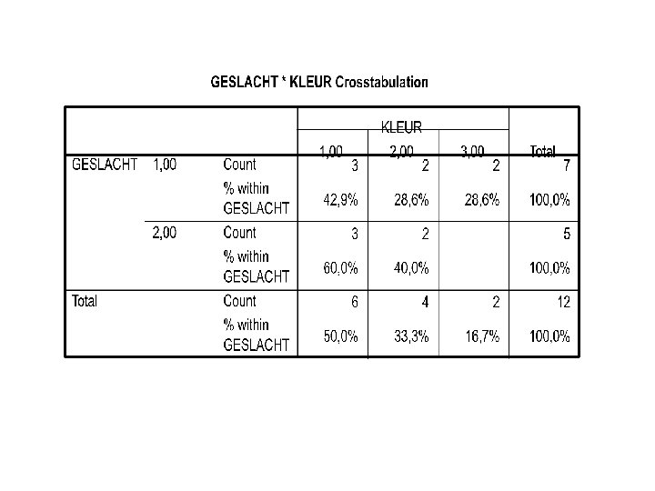 GESLACHT * KLEUR Crosstabulation Count GESLACHT 1, 00 2, 00 Total KLEUR 1, 00 2, 00 3, 00 Total 3 3 2 2 2 7 5 6 4 2 12