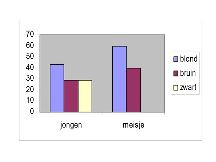 B. Beschrijven van relaties • Bij kruistabellen altijd percentages in twee richtingen mogelijk rij-percentages en kolompercentages GESLACHT * KLEUR Crosstabulation KLEUR 1, 00 2, 00 GESLACHT 1, 00 Count 3 2 % within KLEUR 50, 0% 2, 00 Count 3 2 % within KLEUR 50, 0% Total Count % within KLEUR Total 3, 00 2 7 100, 0% 58, 3% 5 41, 7% 6 4 2 12 100, 0%