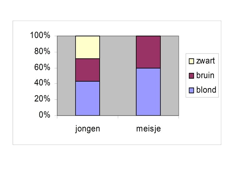 A. Marginale verdelingen • Marginale verdelingen = totalen van beide variabelen uit onderrand en rechterkolom • Relaties tussen kwalitatieve variabelen door uit de aantallen de percentages te berekenen • Grafisch voorstellen in staafdiagram : hoogte van de staaf is percentage • Gesegmenteerd staafdiagram : 100% in 1 staaf voorgesteld : vergelijking
