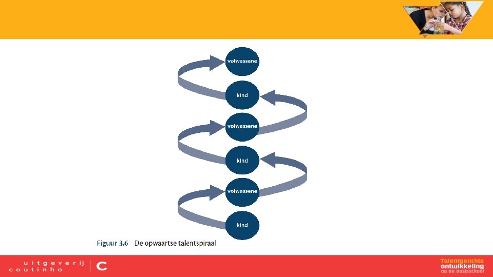 Talent als opwaartse spiraal • • • Leerkracht en kind beïnvloeden elkaar voortdurend Het proces wordt per stap bijgestuurd Het heeft een zelforganiserend karakter vanuit de interacties Allerlei factoren versterken elkaar Dit kan leiden tot excellentie Let op: een neerwaartse spiraal is ook mogelijk