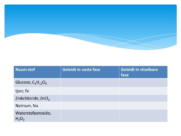 Geleiding in vaste toestand Geleiding in vloeibare toestand Formule Soort stof Bouwstenen Moleculair Ongeladen moleculen Nee niet-metalen Zouten Ionen Nee Ja metaal-/nietmetaal Metalen vrije elektronen Ja Ja metalen